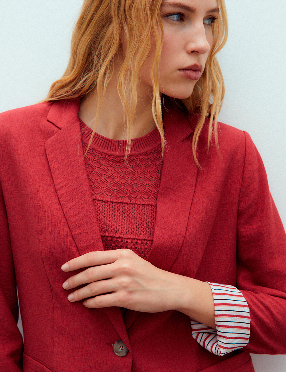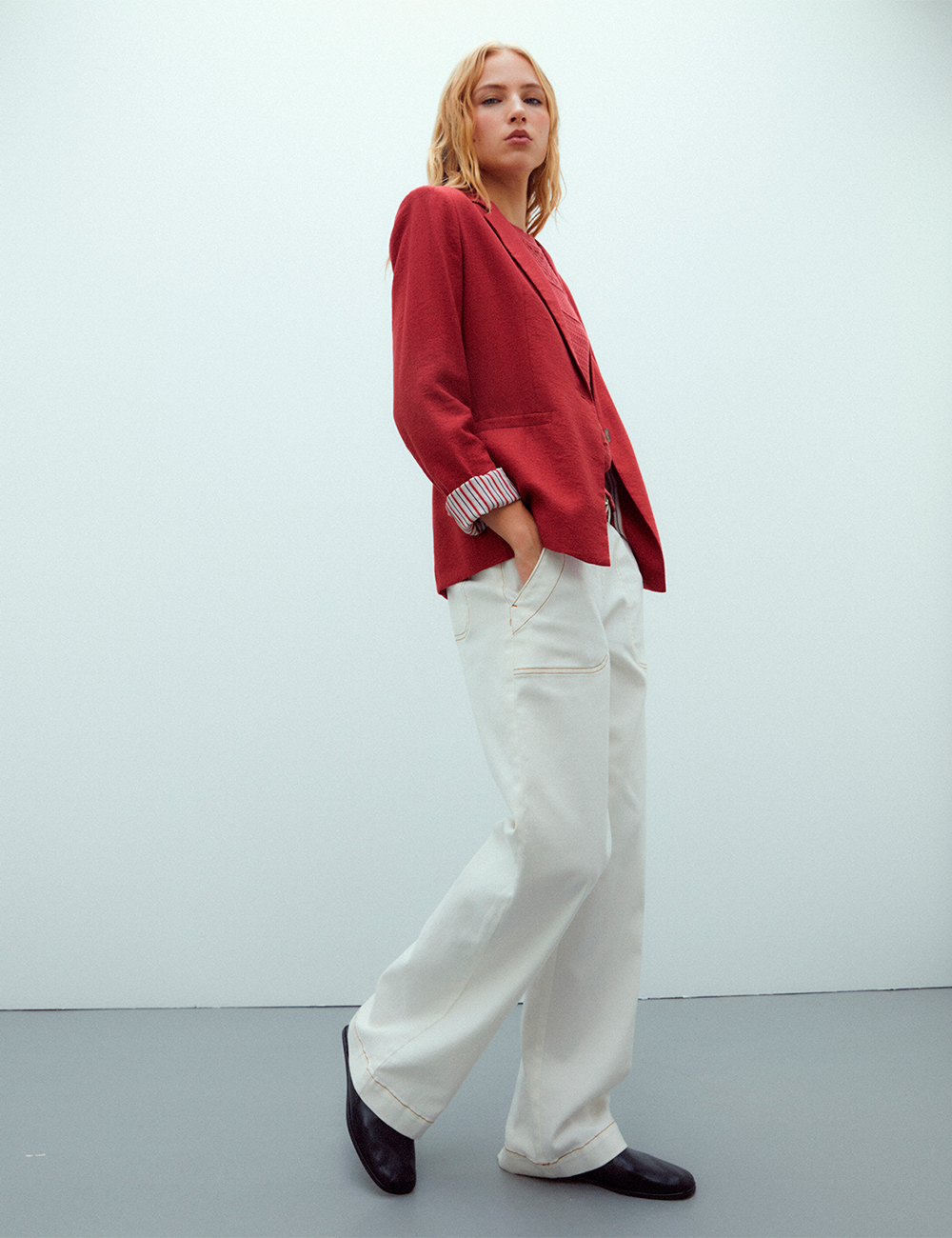 Llévala abierta con vaqueros o en conjunto con el pantalón a juego para un traje actual, fresco y favorecedor.